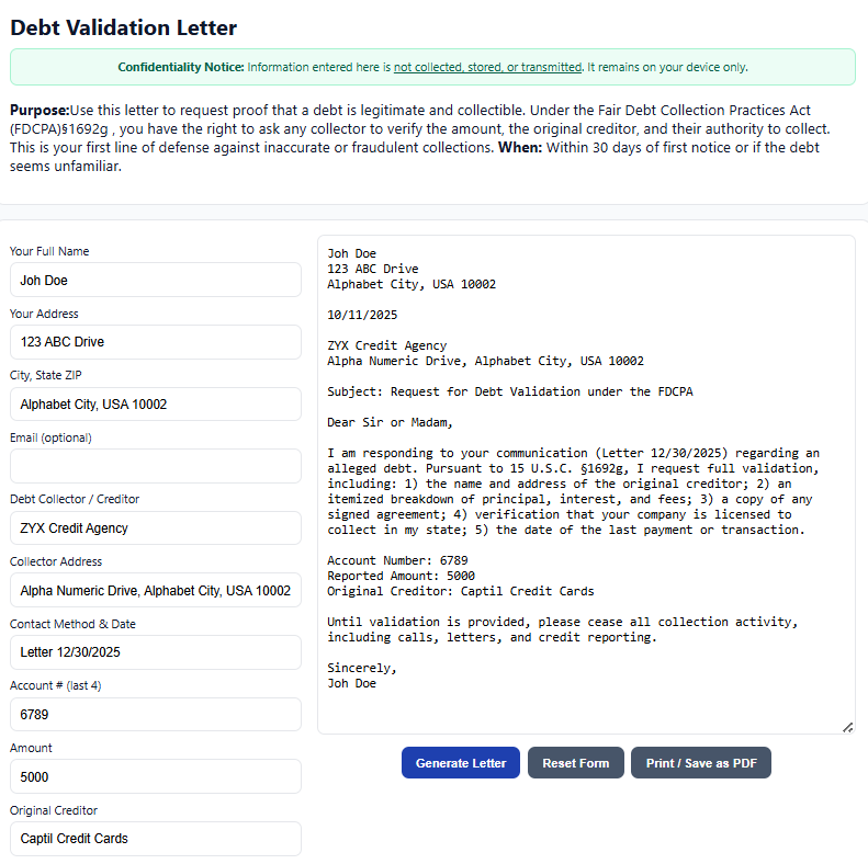 A Debt Validation Letter is your first line of defense when a collection agency contacts you about a debt. Under the Fair Debt Collection Practices Act (FDCPA, 15 U.S.C. §1692g), you have the right to demand proof that the debt is valid, that the collector is authorized to collect it, and that the amount is accurate. When to Use: